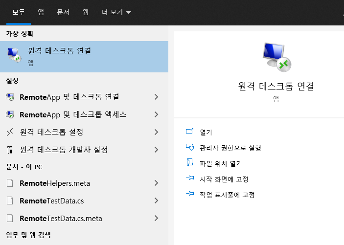 이제 다 되었습니다. 윈도우 검색에서 원격 데스크톱 연결을 실행시켜 줍니다.
